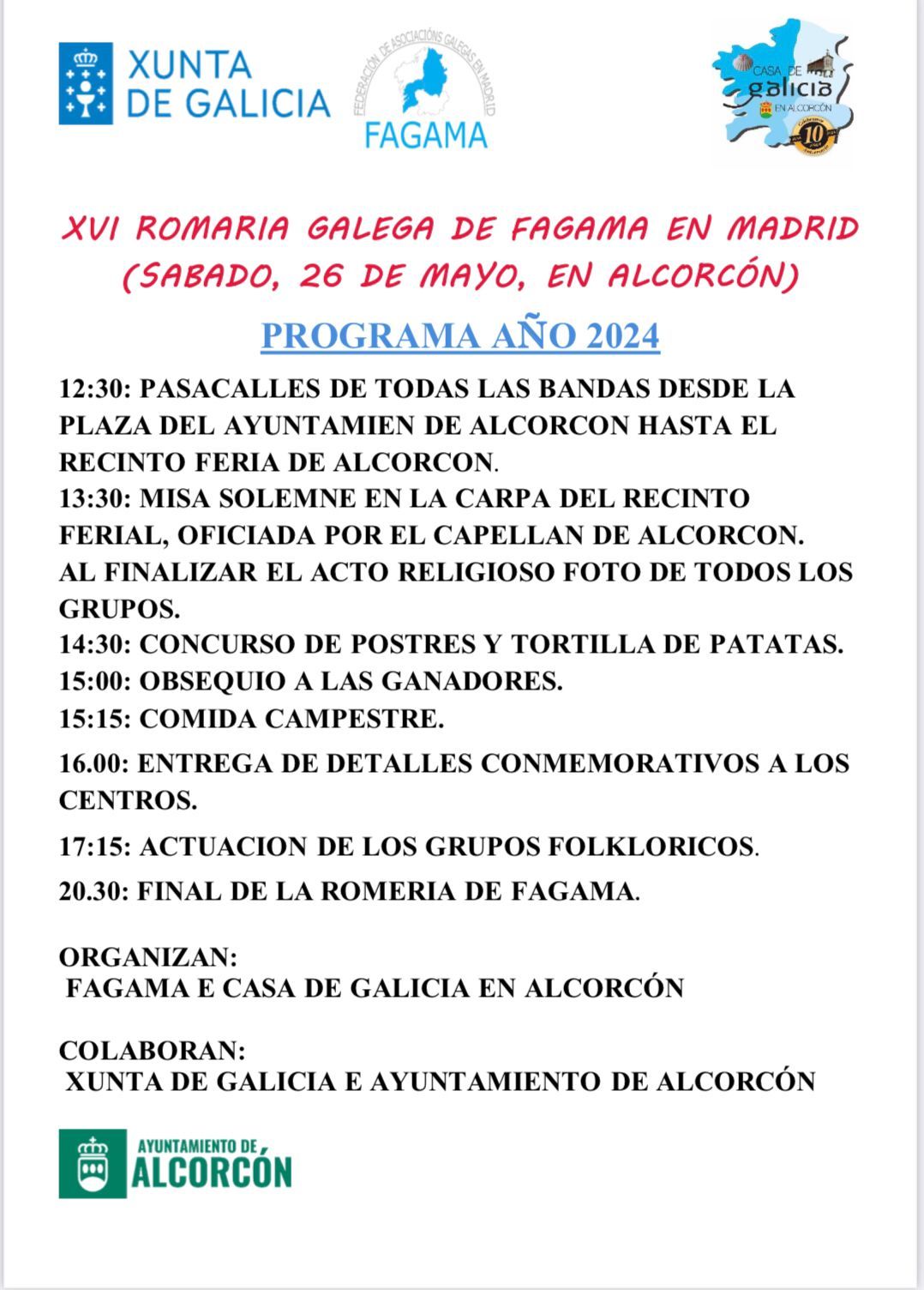 Estaremos celebrando el 10º aniversario de La Casa Galicia de Alcorcon del miércoles 22 de mayo al domingo 26 de mayo, en el recinto ferial de Alcorcon.